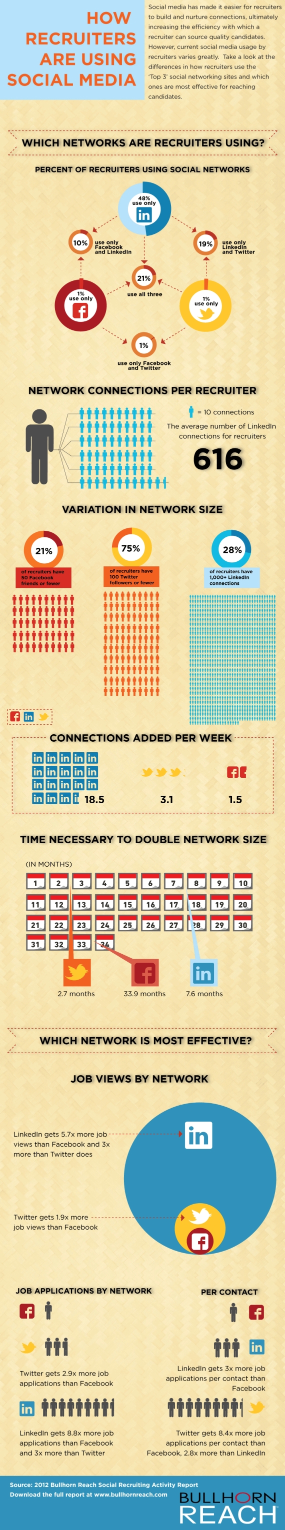- Recruiters add more Twitter followers to their network per week than Facebook, and they will grow their Twitter networks much faster than their networks on Facebook.
